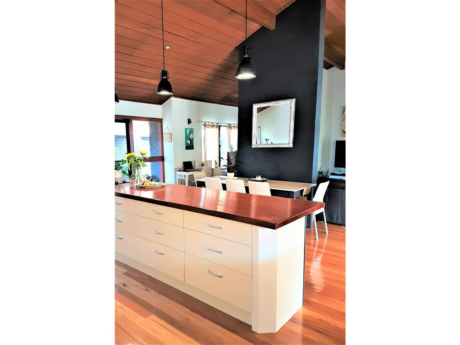 - Modern kitchen with large 3.5 metre stunning Blue Gum timber natural edge island bench with 9 large drawers